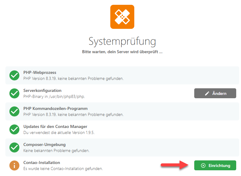 Es folgt eine Systemprüfung. Wenn alle Vorgaben erfüllt sind zeigt die Systemprüfung dieses Ergebnis und die Einrichtung der Installation kann gestartet werden: