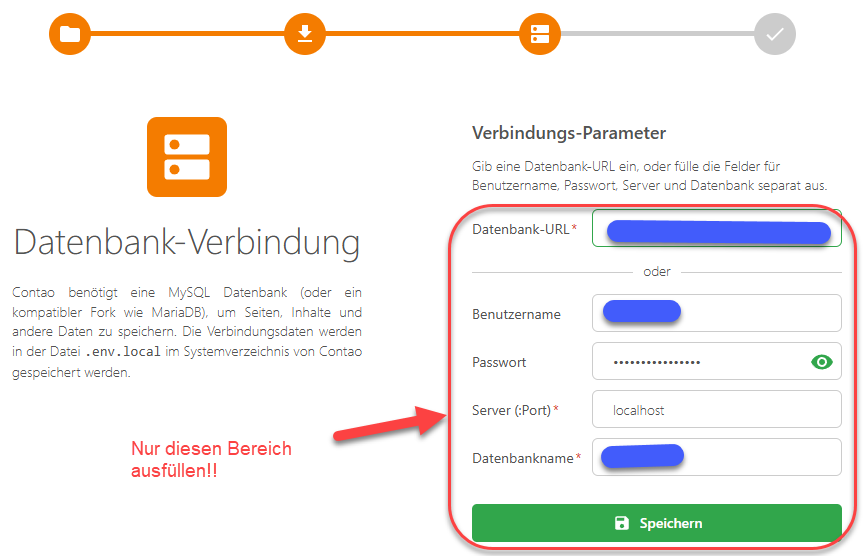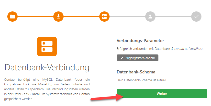 Jetzt muss der Datenbankzugang eingestellt werden. Die entsprechenden Daten wurden im Control-Center angezeigt und sollten in dem vorherigen Browser-Tab/Fenster noch sichtbar sein: